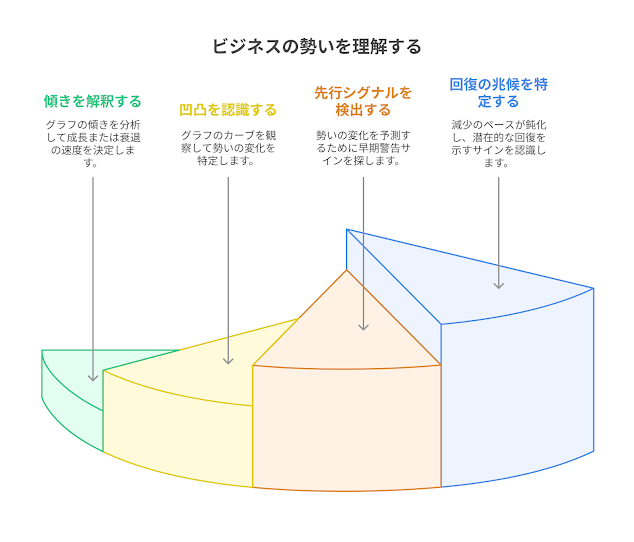 • 傾きの変化が示す「勢い」: グラフの傾きは事業の「速度」を、カーブの形(凹凸)は事業の「勢い」の変化を示します。グラフがまだ上昇していても、そのカーブが丘の頂点のように下に凸(成長の勢いが失われつつある)に変わり始めたら、それはグラフが実際に下降に転じるよりもずっと前に、勢いの衰えを警告する重要な先行シグナルです。逆に、下降しているグラフが谷底のように上に凸(減少のペースが鈍化し、底を打つ可能性)に変化し始めたら、それは回復の兆候を示唆する最初のサインとなります。
