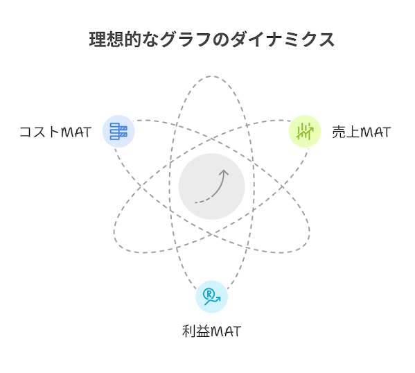 売上、利益、コストの移動年計グラフを比較する際、最も理想的なのは売上MATと利益MATが共に右肩上がりに上昇し、かつ利益MATの傾きが売上MATの傾きと同等か、それ以上に急であることです。一方、コストMATは、売上や利益の成長率よりも緩やかな上昇、あるいは横ばいを維持していることが望ましいです。