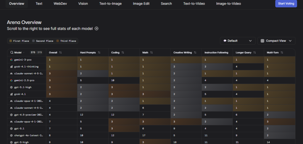 こちらはLMアリーナという、ユーザーが生成AIのブラインドテストを行うサイトです。こちらでもGemini 3.0 proが1位ですね。各ジャンルのスコアも公開されていますが、完全にぶっちぎりです。