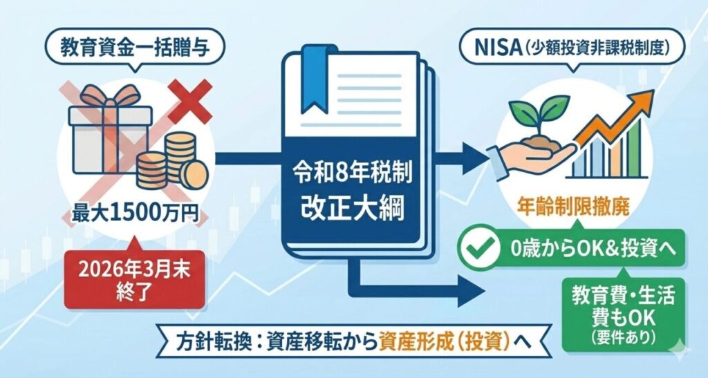 - 終了案: 教育資金一括贈与は令和8年3月末で廃止の方針。