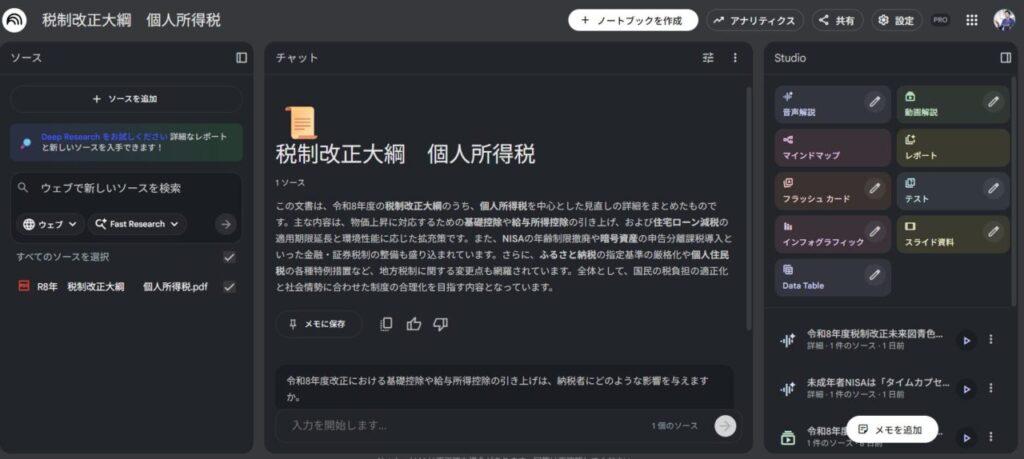 2025年12月19日に発表された「令和8年税制改正大綱」。この難解かつ膨大な資料を読み解くのに、NotebookLMが大活躍しました。ここでは、精度の高い回答を引き出すための「プロの使いこなし術」をご紹介します。